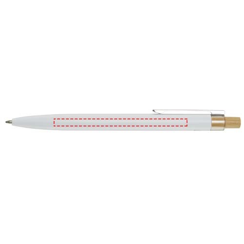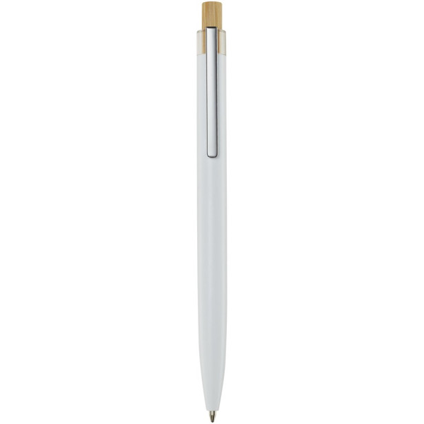 Der Nooshin Kugelschreiber wird aus recyceltem Aluminium hergestellt, was weniger Energie benötigt als die Herstellung von Aluminium aus Rohstoffen. Es reduziert außerdem die Abfallmenge auf Mülldeponien und trägt dazu bei, natürliche Ressourcen zu schonen und Treibhausgasemissionen zu reduzieren. Druckknopf ist aus Bambus gefertigt. Tintenfarbe: Schwarz. Schreiblänge: 800 Meter. Spitzengröße: 1,00 mm.