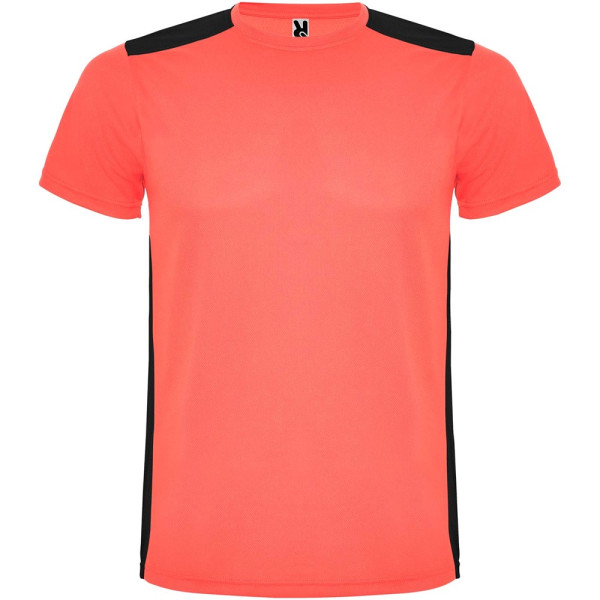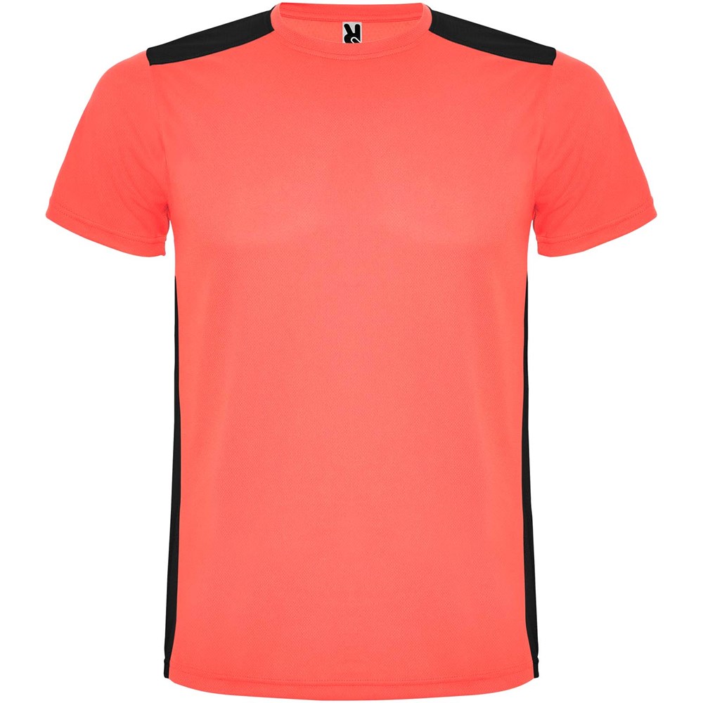 Funktions-T-Shirt aus atmungsaktivem Stoff. Rundhalsausschnitt. Kombination aus zwei Polyestergeweben im Rücken- und Schulterbereich. Polyester Bienenwabe Vorne und 3D-Netz Polyester auf Schulter und Rücken. Material ist feuchtigkeitabsorbierend. Ziernähte auf den Schultern und Seiten. Schnitt mit verlängertem Rückenteil. Abnehmbares Etikett.
