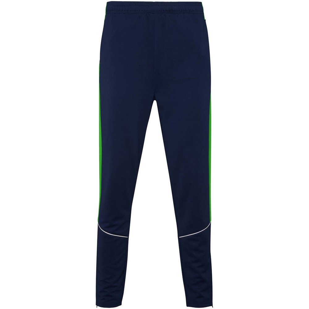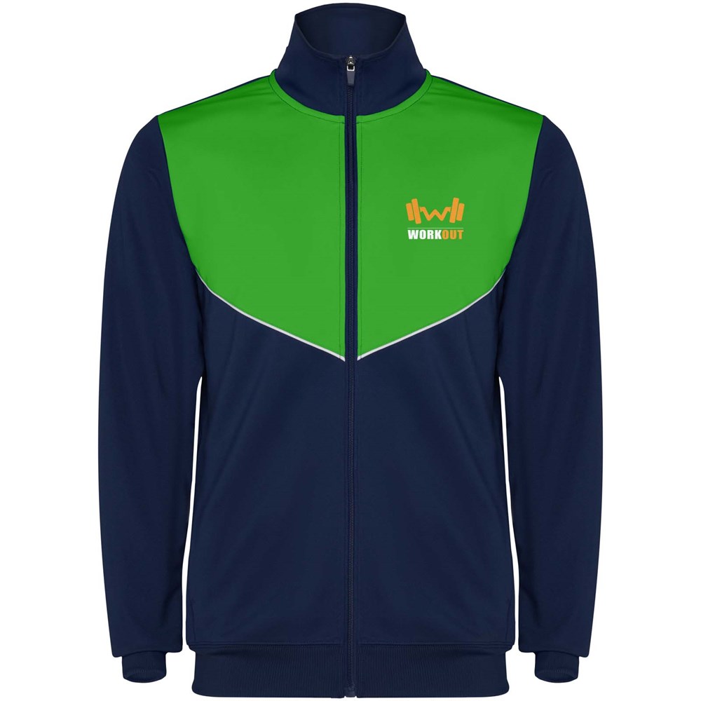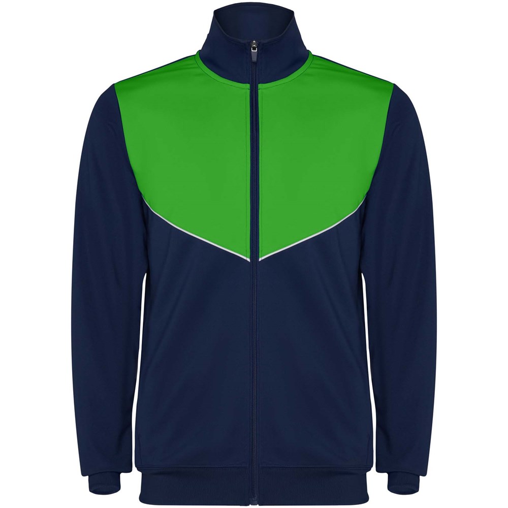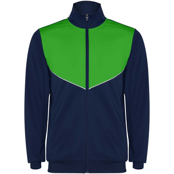 Trainingsanzug aus leichtem und elastischem Stoff. Jacke mit farblich abgesetzten Nähten im Brustbereich. Hoher Kragen mit Kontrastnähten. Zentraler Frontreißverschluss. Seitentaschen. 2x2-Rippenbündchen an Ärmeln und Bund. Hose mit elastischem Bund und Kordelzug. Seitliche Kontrasteinsätze mit Steppnaht. Beinsaum mit Reißverschluss.