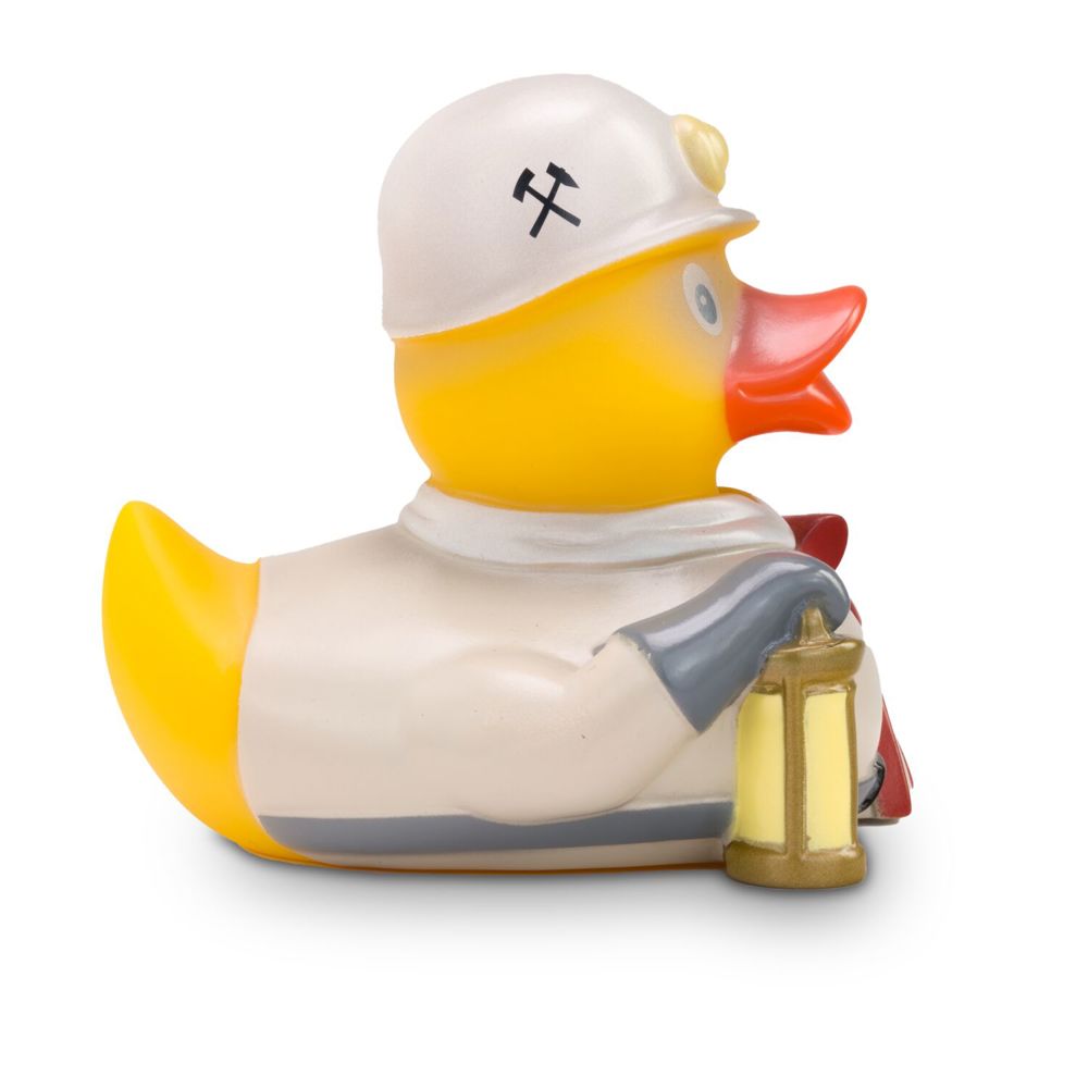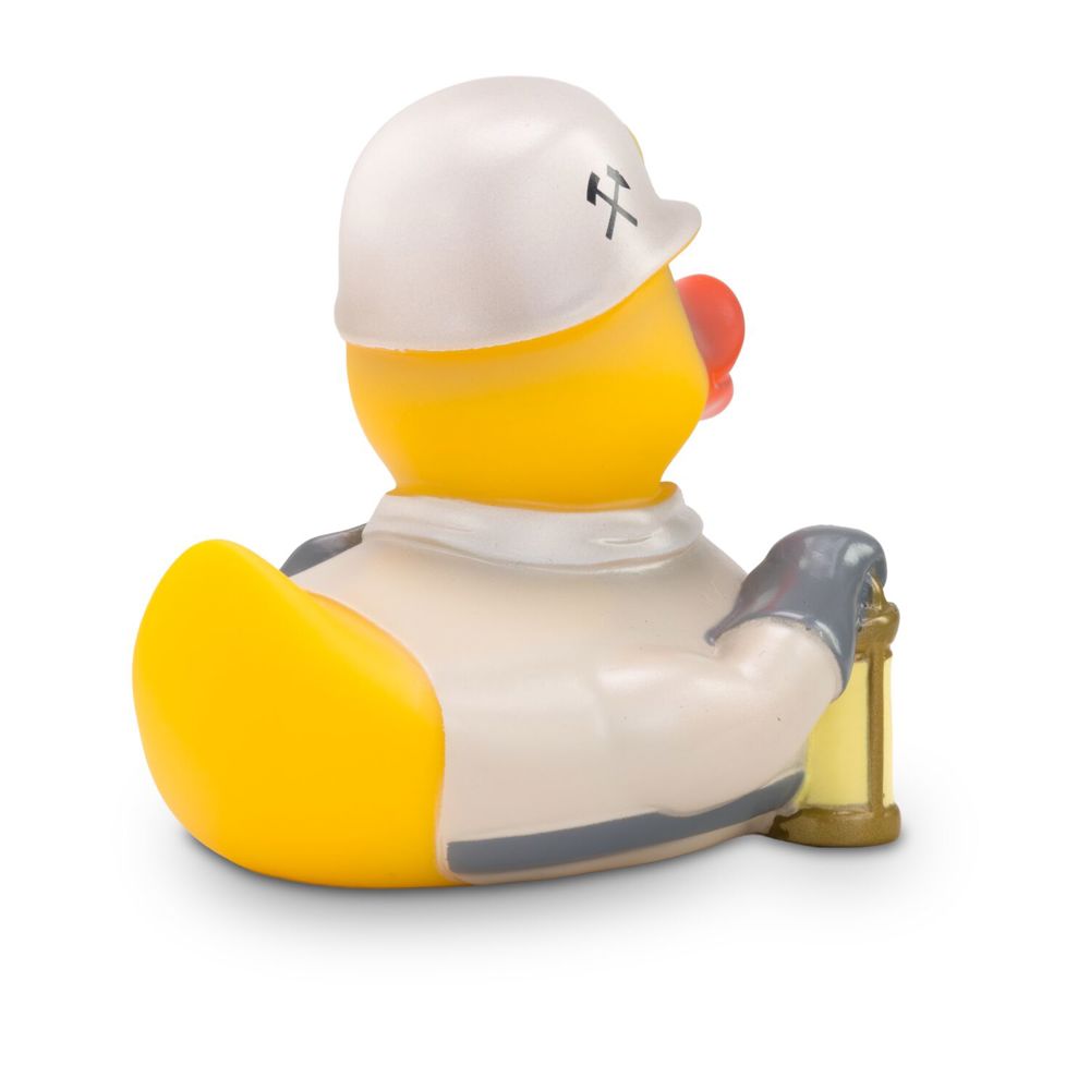 Bernhard Bergmann ist die letzte Arbeiter-Ente aus dem Kohlebergwerk. Er trägt sein Werkzeug bestehend aus einem Förderturm und einem Pickel stets bei sich. Auf dem Kopf trägt er einen weißen Helm mit Lampe und unter dem Flügel hat er seine traditionelle Grubenlampe für eine gute Sicht bei sich. Größe: ca. 8 cm. Inklusive Quietschventil