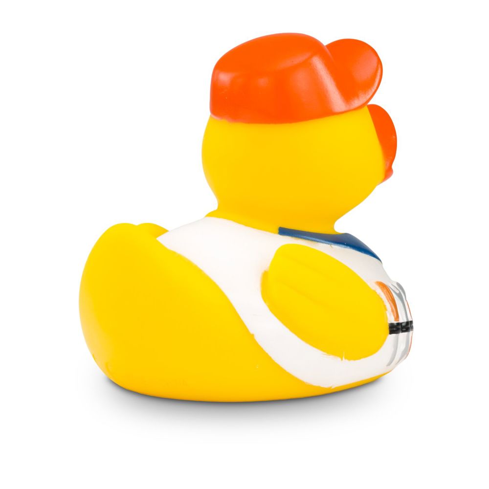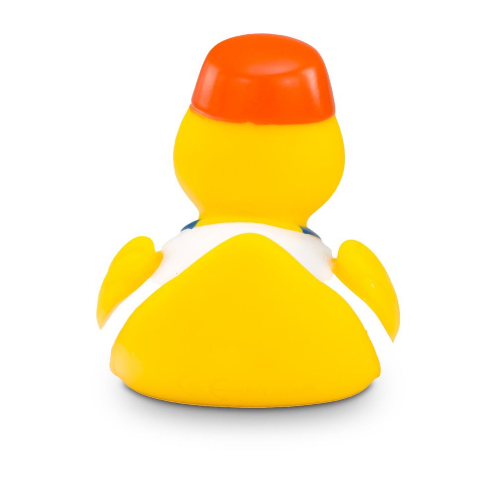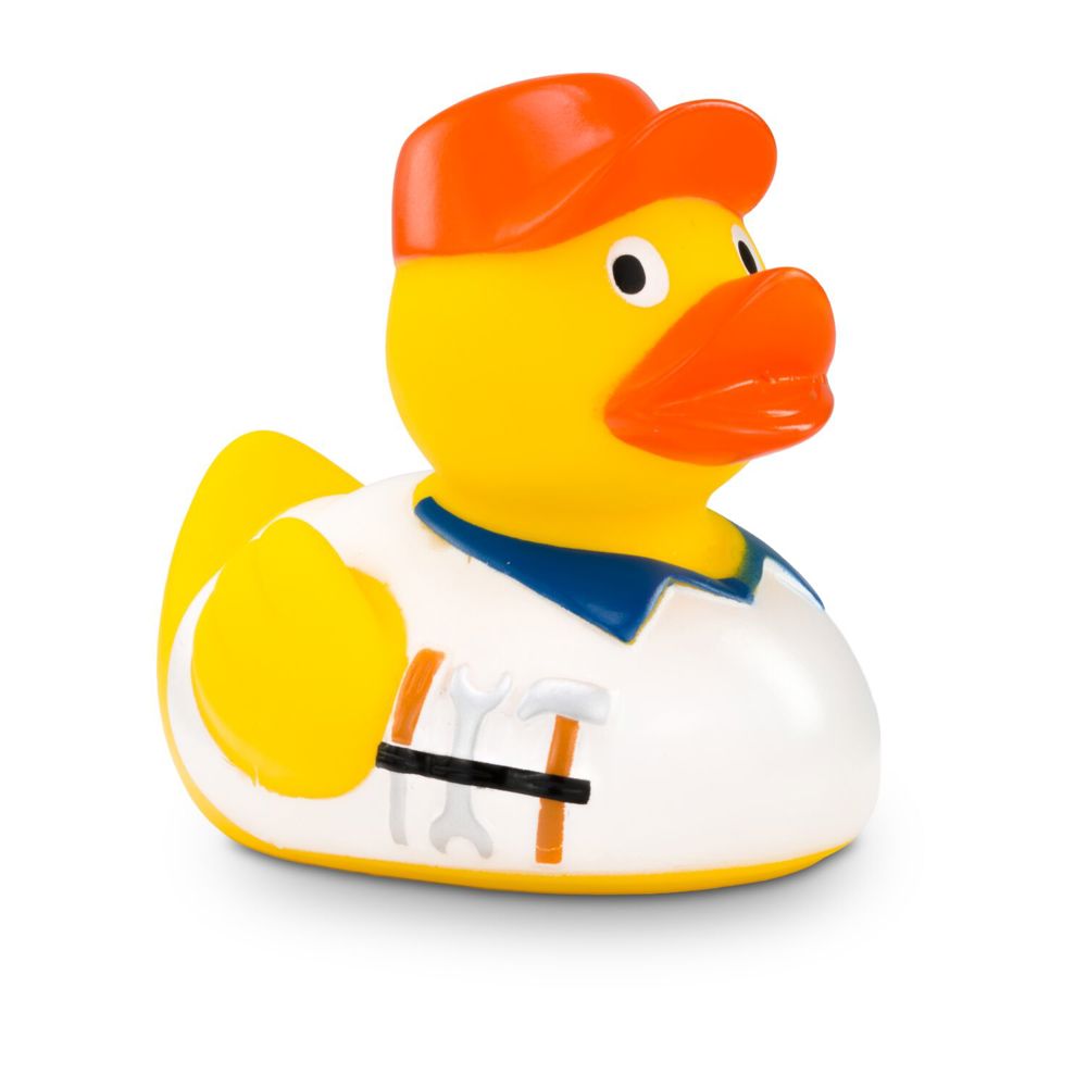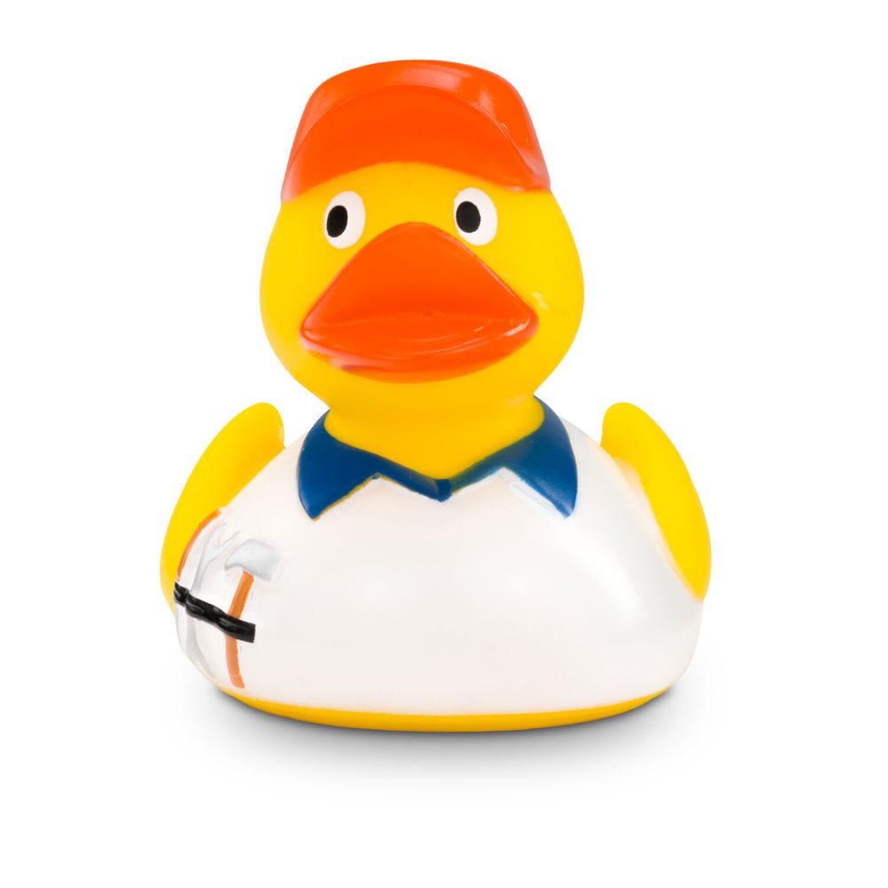 Badeente Hugo Handwerker - die perfekte Quietscheente für alle Hand- und Heimwerker. Mit grüner Kappe, orangenem Hemd, dunkelblauem Kragen und praktischem Werkzeug-Gürtel ist diese Ente ideal für alle, die viel auf Baustellen sind und Werkzeug lieben. Größe: ca. 8 cm. Inklusive Quietschventil
