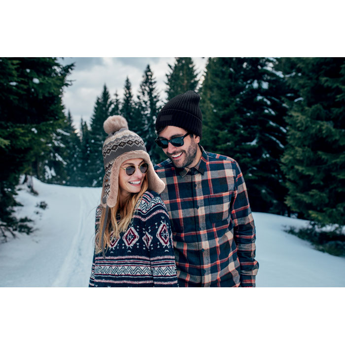 Gestrickte Mütze mit Ohrenklappen und Bommel aus Acrylfaser mit Polyester- und Fleece-Futter. Mit Label zur Werbeanbringung. Einheitsgröße.