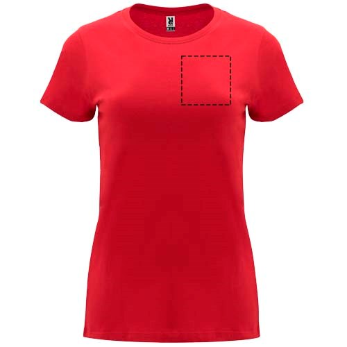Tailliertes kurzärmeliges T-Shirt für Damen. Rundhalsausschnitt mit 1×1 Rippstrick. Verstärkte und verdeckte Nähte am Kragen. Herausnehmbares Etikett.