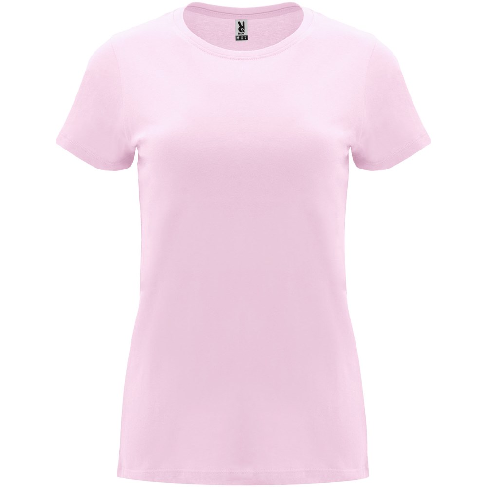 Tailliertes kurzärmeliges T-Shirt für Damen. Rundhalsausschnitt mit 1×1 Rippstrick. Verstärkte und verdeckte Nähte am Kragen. Herausnehmbares Etikett.