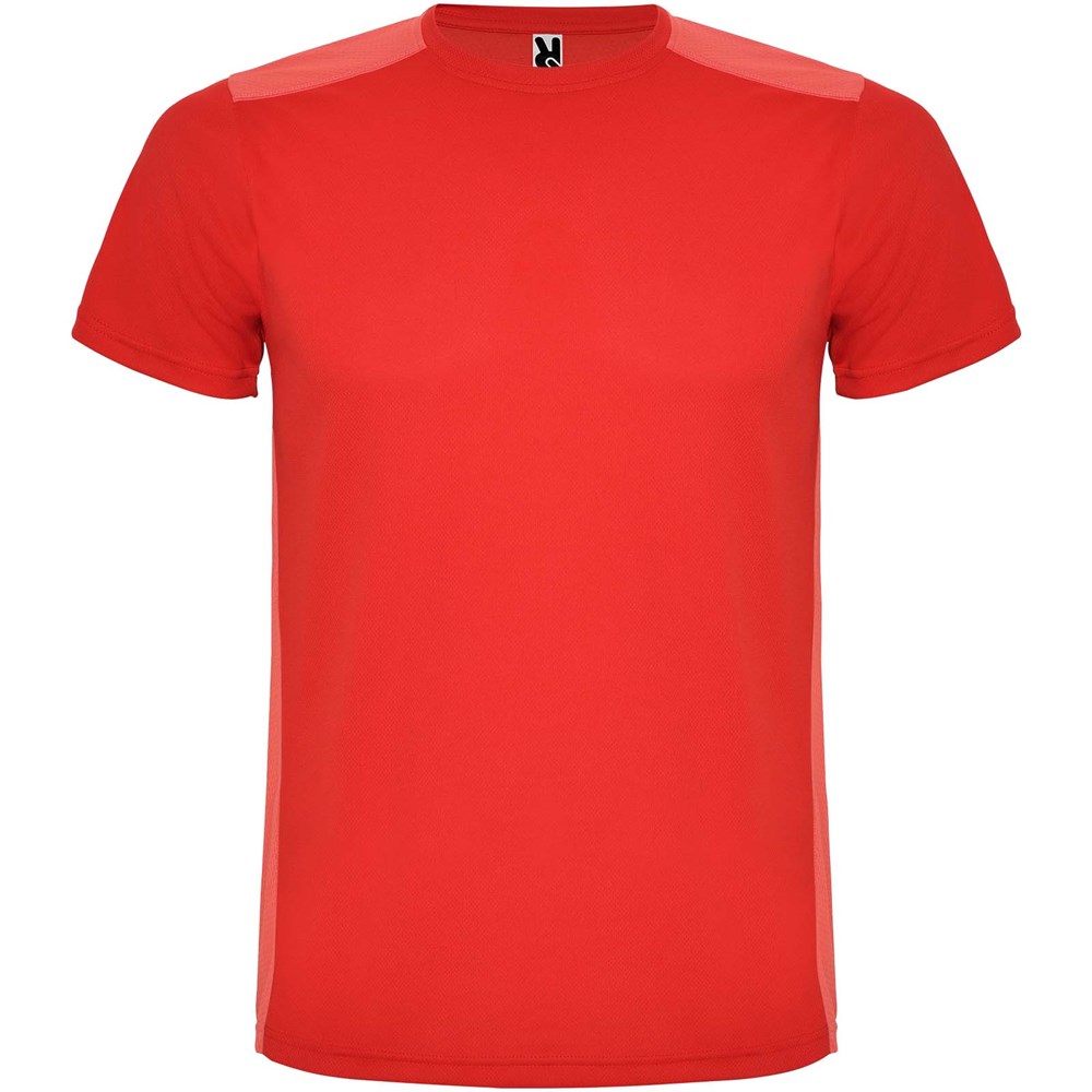 Funktions-T-Shirt aus atmungsaktivem Stoff. Rundhalsausschnitt. Kombination aus zwei Polyestergeweben im Rücken- und Schulterbereich. Polyester Bienenwabe Vorne und 3D-Netz Polyester auf Schulter und Rücken. Material ist feuchtigkeitabsorbierend. Ziernähte auf den Schultern und Seiten. Schnitt mit verlängertem Rückenteil. Abnehmbares Etikett.