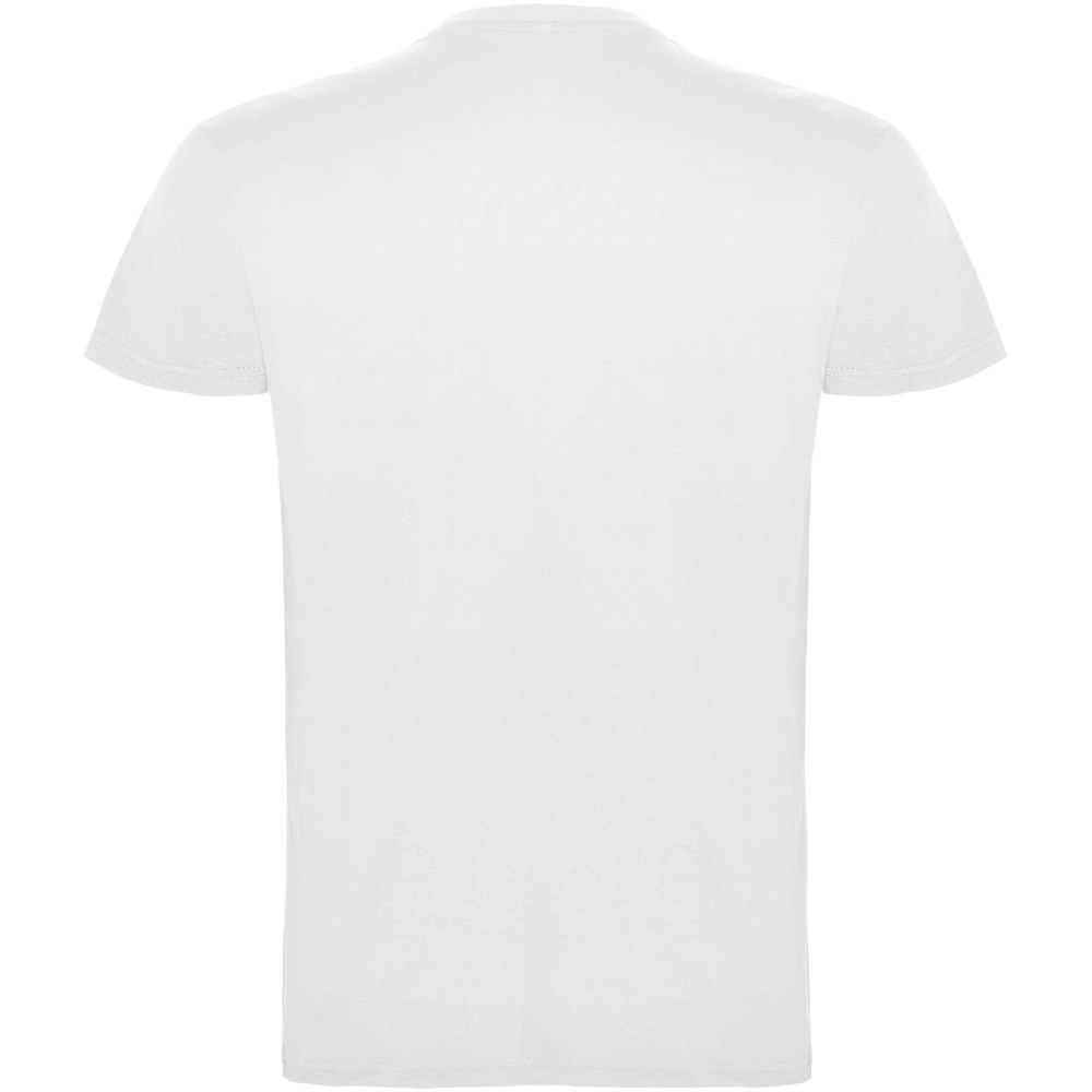 Kurzärmeliges T-Shirt mit doppellagigem Rundhalsausschnitt aus Elasthan, hergestellt aus schlauchförmigem Material für Erwachsene. Verstärkte und verdeckte Nähte am Kragen. Herausnehmbares Etikett. Das Modell ist 190 cm groß und trägt Größe L.
