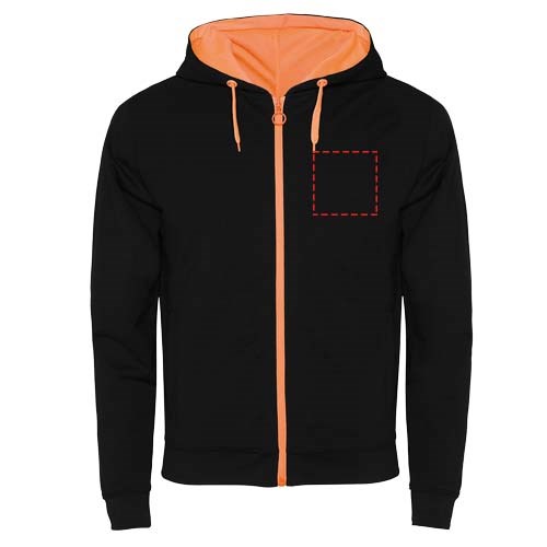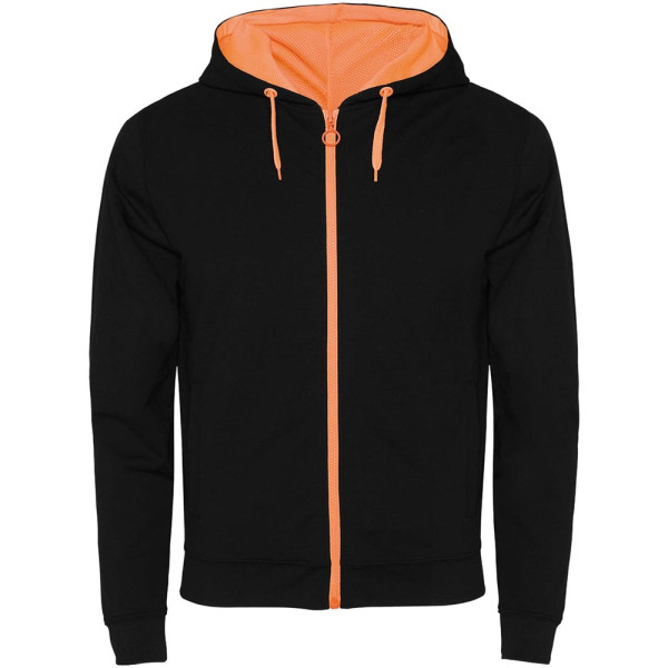 Sweatjacke aus ungebürstetem Fleece mit fluoreszierenden Verzierungen. Reißverschluss in der Mitte mit Zipper in Kontrastfarbe. Kapuze mit Innenfutter aus mikroperforiertem Polyesterstoff in fluoreszierender Kontrastfarbe. Kordelzug und Metallösen in fluoreszierender Kontrastfarbe. 1×1-Rippstrick an Bündchen und Taille. Zwei Taschen auf der Vorderseite mit breitem Saum. Verstärkte und verdeckte Nähte am Innenkragen. Abnehmbares Etikett.