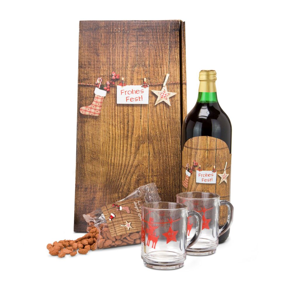 Ein eigener kleiner Weihnachtsmarkt für zu Hause: 1 Flasche traditioneller Nürnberger Glühwein (1 l), 2 Glühweintassen (je 200 ml) mit winterlichem Dekor und 100 g dragierte Erdnüsse mit weihnachtlichem Motiv. Genießen Sie den Duft und den Geschmack der vorweihnachtlichen Adventszeit in einer ruhigen Stunde zu Hause - ganz ohne Gedränge!
